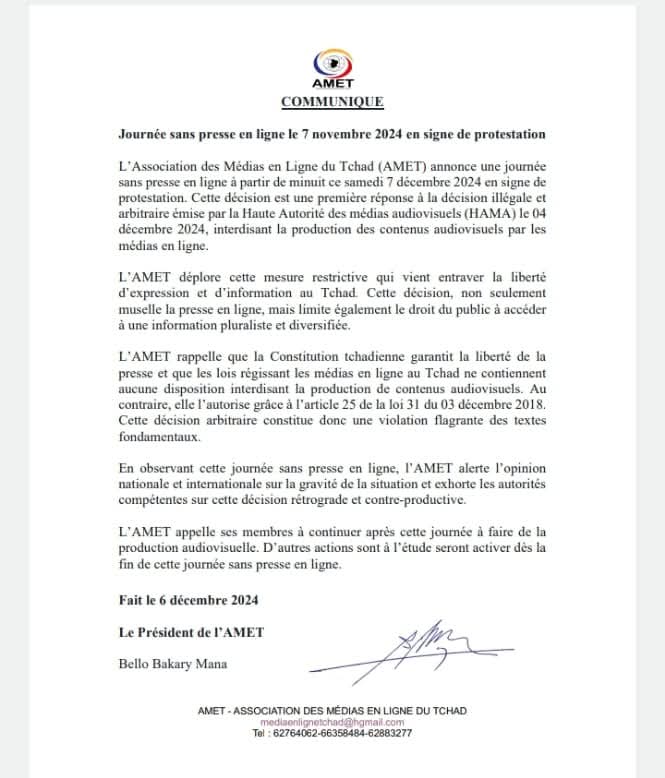 أعلنت جمعية وسائل الإعلام الإلكترونية في تشاد (AMET) تنظيم يوم احتجاجي تحت شعار "يوم بلا صحافة إلكترونية" وذلك اليوم السبت، 7 ديسمبر 2024، بدءًا من منتصف الليل.