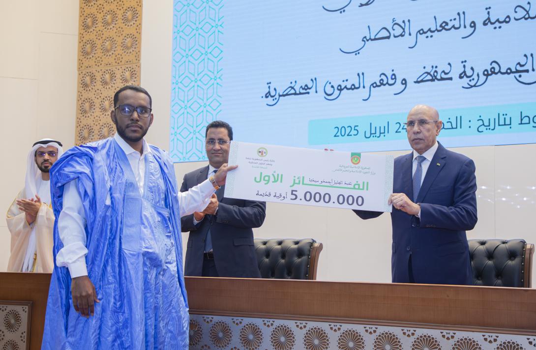 وتسلم الفائز الأول جائزته البالغة خمسة ملايين أوقية قديمة من رئيس الجمهورية، فيما سلم الوزير الأول الجائزة الثانية، وقدرها أربعة ملايين أوقية قديمة، وسلم وزير الشؤون الإسلامية والتعليم الأصلي الجائزة الثالثة البالغة ثلاثة ملايين أوقية قديمة.