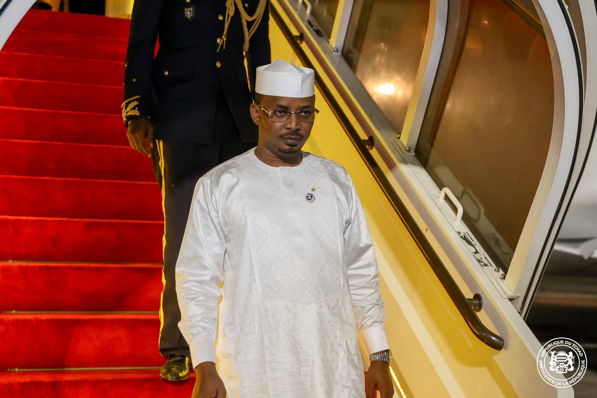 ولدى وصوله إلى مطار حسن جاموس الدولي في نجامينا، كان في استقباله الوزير الأول، رئيس الحكومة، السفير الله ماي حلينا، إلى جانب عدد من أعضاء الحكومة وكبار المسؤولين العسكريين والمدنيين، من بينهم الأمين العام لرئاسة الجمهورية، وقادة الأركان، ومستشار الأمن، وعمدة العاصمة.