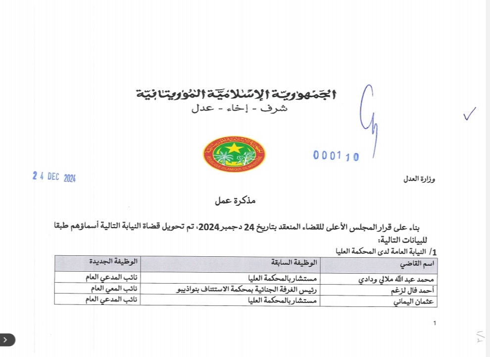ترأس الرئيس الموريتاني، محمد ولد الشيخ الغزواني، اليوم، اجتماع المجلس الأعلى للقضاء، حيث تم الإعلان عن تحويلات وتعيينات جديدة شملت عددا من القضاة في النيابة العامة ومحاكم الولايات.