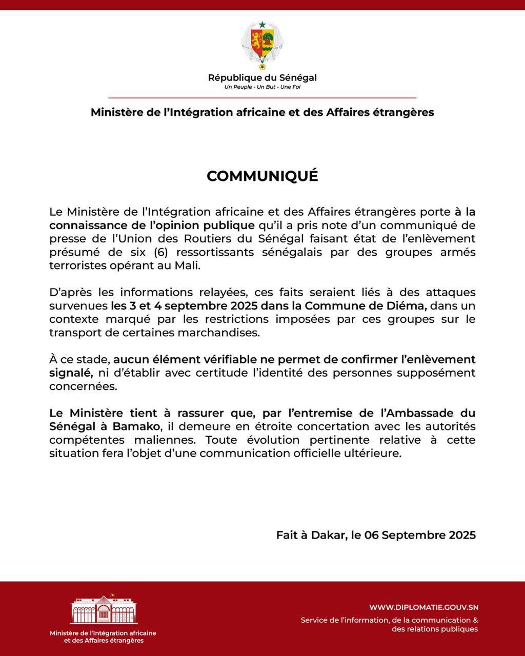 وأكدت الوزارة أنها تتابع الوضع عن كثب عبر سفارة السنغال في باماكو، وفي تنسيق مباشر مع السلطات المالية المختصة، مشيرة إلى أن أي تطورات جديدة بهذا الخصوص ستعلن عبر قنوات رسمية.