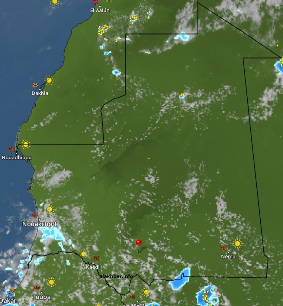 وأفادت المعطيات الحالية بوجود سحب ماطرة خفيفة على الحدود الجنوبية للبلاد وأخرى متفرقة على ولاية الترارزة، فيما تنتشر سحب محدودة شمال البلاد في منطقة غير مأهولة.