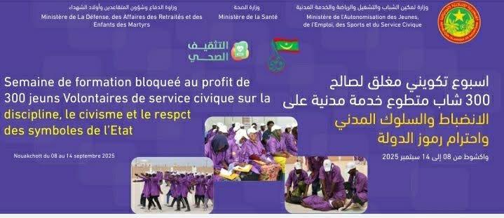 التيار(نواكشوط) - تنطلق غدا الاثنين بدار الشباب في توجنين وفضاء الشباب في الميناء، فعاليات أسبوع تكويني مغلق يستفيد منه 300 شاب من متطوعي الخدمة المدنية، في إطار شراكة بين وزارة تمكين الشباب والتشغيل والرياضة والخدمة المدنية ووزارة الدفاع وشؤون المتقاعدين وأبناء الشهداء.