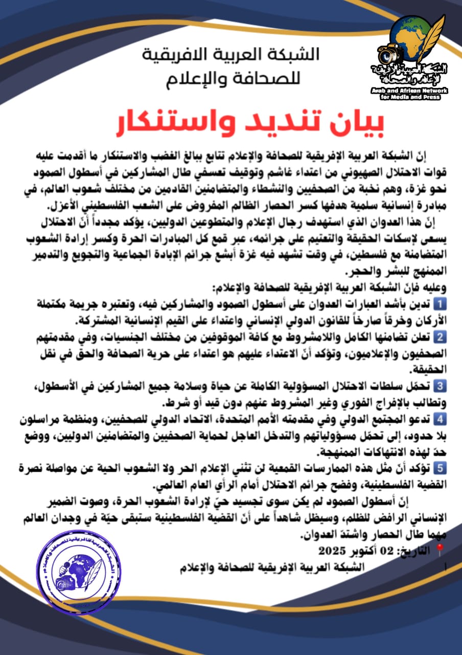 التيار (نواكشوط) - أدانت الشبكة العربية الإفريقية للصحافة والإعلام ما وصفته بـ"الاعتداء الغاشم والتوقيف التعسفي" الذي طال المشاركين في "أسطول الصمود نحو غزة"، مؤكدة أن ما جرى يمثل "جريمة مكتملة الأركان وخرقا صارخا للقانون الدولي الإنساني واعتداء على القيم الإنسانية المشتركة".